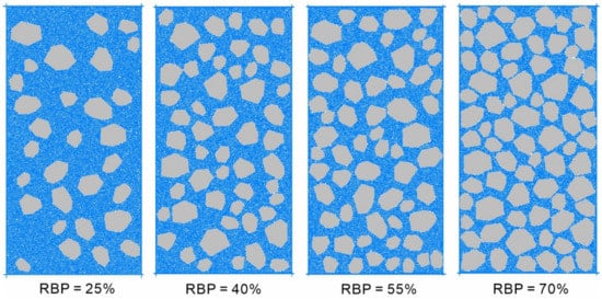 The concepts of “soil” and “rock” in an S-RM are relative, and Medley and co-workers pointed out that the characteristic size of the research object is the basis for determining the size range of “rock blocks” [1], and the soil/rock threshold can be defined as , where is the soil/rock threshold of the S–RM and comprises the dimension of a laboratory specimen [19] ( was set to 300 mm in this study). Therefore, the minimum size of the rock blocks in the model was 15 mm. Considering the generation efficiency and computational accuracy for the rock blocks, their sizes were simplified to a range of 30–80 mm. In addition, the number of sides of a rock block and the density of the rock blocks, , were set to 4–8 and 2700 kg/m3, respectively. A contact-bond model with a coefficient of friction of 0.5 and normal and tangential strengths of 1.5 kN was used to simulate the soil–rock interfaces. Similarly, a contact-bond model was used to simulate the soil particles. The soil particle size was set to 1.5–2.0 mm. Four models with rock block proportions (RBPs) of 25%, 40%, 55%, and 70% were established (Figure 4). The confining pressure was set to 0.5 MPa.