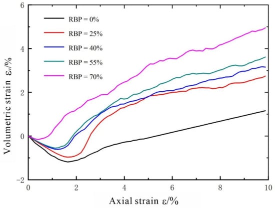During the biaxial compression process, the volumetric strain of a specimen is generally reflected by a shear dilation and contraction. Figure 7 shows the recorded volumetric strain–axial strain curves for the specimens (a shear dilation and a shear contraction are deemed positive and negative, respectively). A consistent dilation/contraction pattern can be observed in the S-RM specimens with different RBPs. The volume of a specimen first decreases, that is, a specimen first undergoes a shear contraction, the extent of which increases as the RBP increases. As the axial strain increases to 1–2%, the shear contraction gradually stops increasing, followed by a gradual increase in the volumetric strain (i.e., a shear dilation). An increase in the RBP reduces the shear contraction and increases the shear dilation, for the following reason: As the RBP increases, the amount of soil proportionally decreases. The initial shear contraction of a specimen is caused by the compaction of the soil particles. At a high RBP, it takes a short time for the soil to become compacted. As the axial strain increases, relative dislocations occur between the rock blocks, and some rock blocks become suspended, resulting in an increase in the volumetric strain of the specimen. Moreover, a large number of irregular rock blocks leads to a higher shear dilatancy.