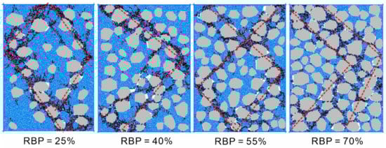Figure 8 shows the morphology of the S-RM specimens at failure under a confining pressure of 0.5 MPa and a strain of 10%. The shear-zone distribution patterns show that a high RBP leads to a wide shear zone. At failure, of all the S-RM specimens, the S-RM specimen with an RBP of 70% contains the most widely and complexly distributed cracks and the widest shear zone. In addition, in this specimen, a notable “rock bypassing” phenomenon, as well as collision and contact between the surrounding rock blocks, can be observed in its shear zone, which is distributed in a relatively discontinuous manner. Only the rock blocks near the shear zone have some aggregation and contact, and there is no obvious displacement of the rock blocks outside the shear zone, which is shown in the simulation results. On this basis, the following formation and evolution pattern of cracks in an S-RM arises. First, the soil and rock blocks in an S-RM have significantly different mechanical properties, so their deformation is incompatible, which leads to stress concentration at the soil–rock interfaces. As a result, the soil–rock interfaces become weak links in the S-RM, where first cracks are formed and propagate. Moreover, the presence of the rock blocks prevents crack propagation and coalescence, leading to a complex S-RM failure mode. These two factors constitute the development and evolution mechanism of cracks in an S-RM. The simulation results are similar to the indoor test, but the simulation results can more intuitively show the failure mode [32]. In discrete-element simulations, crack evolution is a visual representation of the deformation and failure of S-RMs, so it can satisfactorily reflect their deformation and failure characteristics.