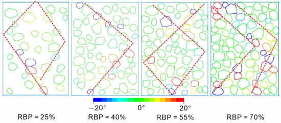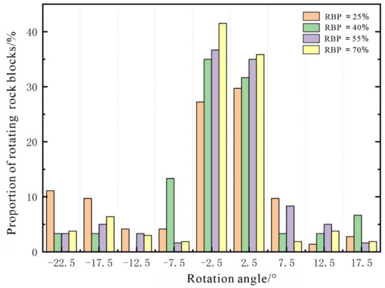 Figure 10 shows the frequency distribution of the angle of rotation of the rock blocks at a strain of 10%. The angle of rotation of the rock blocks ranges mainly from −20° to 20°. Therefore, we set the statistical interval to 5°. Most of the rock blocks rotate by relatively small angles, primarily ranging from −5° to 5°. As the RBP increases, the meshing between the rock blocks strengthens, while their angle of rotation decreases. Consequently, the peak proportion of the rock blocks that rotate gradually increases as the RBP increases. An analysis of the interaction between the rock blocks shows the following. At a low RBP, there is no notable contact between the rock blocks as the specimen undergoes deformation under loading, so the rock blocks can withstand the external force through movement. At a high RBP, the rock blocks are more likely to rotate after collision and meshing with each other. As a result, the rock blocks display notable rotational characteristics at a high RBP.