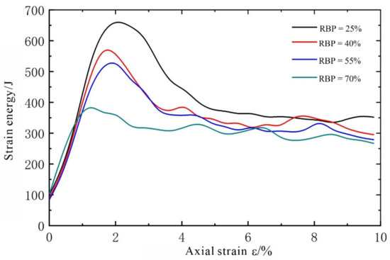 Similar strain energy–axial strain relationships can be observed in the S-RM specimens with different RBPs from Figure 11: The strain energy first increases and then decreases as the axial strain increases, which is similar to the stress–strain relation. In addition, the strain energy decreases as the RBP increases. When RBP = 25%, the strain energy reaches the maximum value of 668.2 J at a strain of 2.04% and then decreases rapidly as the strain increases. The peak values of the strain energy are 585.0, 535.9, and 395.72 J at RBPs of 40%, 55%, and 70%, respectively. At an RBP of 70%, as the strain increases, the strain energy does not decrease significantly after reaching its maximum value. The following can be easily observed from the pattern of strain energy. In a given S-RM specimen, the strain is caused primarily by the deformation of the soil, because the rock blocks undergo no deformation. At a low RBP, the deformation of an S-RM specimen is caused mainly by the deformation between the soil particles, so its strain energy increases rapidly as the axial strain increases. After reaching its maximum, its strain energy decreases rapidly as the axial strain increases, due to the debonding between the soil particles. At a high RBP, the rock blocks tend to support each other, resulting in a small amount of strain energy accumulating in the soil. However, a high RBP leads to a high rate of increase in the strain energy.