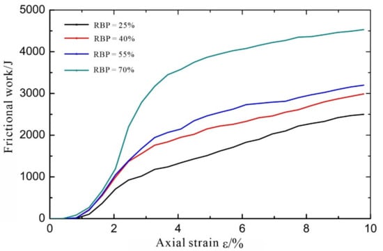 As shown in Figure 12, at the initial stage of the loading process, the rock blocks are not in contact with each other, so there is no friction between them and no strain energy. Although there is friction between soil and rock blocks, according to the previous studies [33], the friction between soil and rock blocks in the S-RM is much smaller than that between rock blocks, so it can often be ignored in the deformation of S-RM. As the strain increases, the rock blocks in each specimen gradually come in contact and mesh with each other, which is reflected by an increase in the frictional work. After the frictional work reaches a certain value, its rate of increase begins to level off, suggesting that the relative positions of the rock blocks are relatively fixed after the adjustment, and that the rock blocks only slide relative to each other. At a low RBP, it takes a long time for the rock blocks to come into contact with each other, and their frictional work is low.