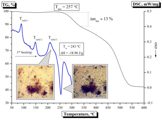 Information about the thermal properties of compounds 1–3 was obtained via the TG/DTG and DSC techniques (Figure 1, Figures S11 and S12). The nature of phase transitions is determined by the nature of the counterion. Compound 1 is characterized by “solid–solid” type phase transitions reproducible in heating and cooling cycles at 134–140 °C. When the counterion is replaced by metathesis by the PF6− ion (3), the system undergoes a series of solid-state transitions at Tsolid 1 = 83 °C, Tsolid 2 = 140 °C, and Tsolid 3 = 197 °C (Figure 1). Compound 2, synthesized from the iron(III) chloride salt, exhibits a different behavior. No crystalline transitions were detected by DSC measurements; only the amorphous state of the sample, with a glass transition temperature of 143 °C, was found. Within the whole series of compounds, no melting or softening point was observed. It was found that all of the compounds have high thermal stability up to 250 °C (373 °C for 1, 390 °C for 2, and 257 °C for 3). A process with an exo-effect occurs near the decomposition temperature, which can be interpreted as crystallization of a substance under the influence of temperature. This is confirmed by the polarizing optical microscopy (POM) data collected upon heating the sample (Figure 1). It was found that the temperature of crystallization process depends on the nature of the counterion (NO3−: 319 °C; Cl−: 386 °C; PF6−: 243 °C). This is probably due to the processes of supramolecular aggregation, which occurs with the formation of intermolecular hydrogen bonds.