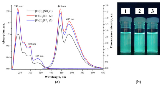 The absorption and fluorescence spectra of compounds 1–3 in dichloromethane, 5 × 10−6 mol/L, λexc = 350 nm, T = 298.15 K (a), and their photographic images in CH2Cl2 solution (b).