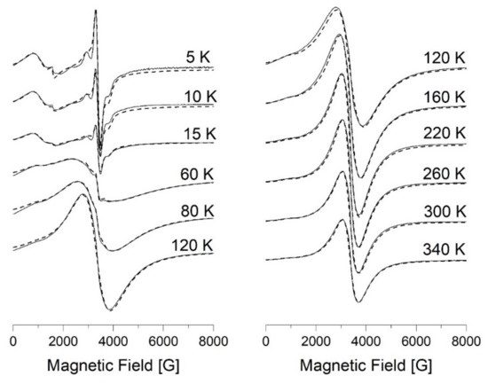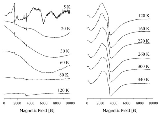 EPR spectroscopy is a powerful technique used to obtain qualitative information about the presence of HS and LS fractions, their evolution with temperature, and to confirm the presence of antiferromagnetic (AFM) interactions. EPR measurements were carried out in the temperature range of 5–340 K. The most illustrative X-band EPR spectra (hν = 0.3 cm–1) are shown in Figure 4, Figure 5 and Figure 6 for compounds 1, 2, and 3, respectively.
