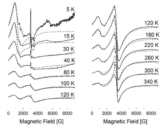 The temperature dependence of the EPR X-band spectra of 2 from 5 K to 340 K. The dashed lines show the theoretical EPR spectra.