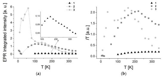 The temperature dependencies of the integrated intensity I of the whole spectra—which is obtained via numerical double-integration of the EPR spectra, and is proportional to the static paramagnetic susceptibility—are shown in Figure 7 for all three compounds. One can see that the temperature dependence of I passes through a broad maximum at Tmax ≈ 160, 120, and 130 K for 1, 2, and 3, respectively. The abnormal increase and decrease in the integral intensity for 3 in the temperature range from 20 to 80 K is probably due to the superposition of a very broad signal from the frozen atmospheric oxygen.
