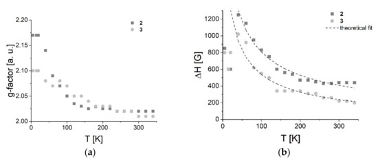 with TN = −20 K, ΔH0 = 4.7 G, A = 22,929 G K0.7 for 2, and TN = −15 K, ΔH0 = −55 G, A = 16,400 G K0.7 for 3 (Figure 8).