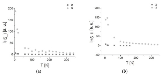 The integrated intensity of the III-type HS centers (measured as the IΔH2 product) has a maximum at T ≈ 100 and 120 K for 2 and 3 (Figure 10). The temperature dependence of this line of integrated intensity in the temperature range from 160 K to 340 K can be described by the Curie–Weiss law with the value of the Weiss constant θ = −23 and −38 K for 2 and 3. Some features of the signal in the range of 160–300 K (temperature-independent position in the field, correspondence of the temperature dependence of the integral signal intensity to the Curie–Weiss law) suggest that the sample is paramagnetic within this temperature range. The negative sign of the Weiss constant indicates the antiferromagnetic character of the interaction between Fe(III) ions with a weakly distorted octahedral environment at temperatures below 100 K.