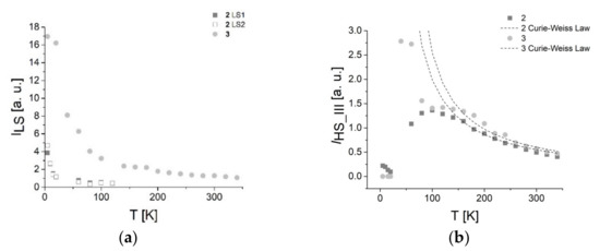 The temperature dependences of the integrated intensity of LS (a) and III-type HS (b) Fe(III) centers in 2 and 3. The dashed lines are calculated within the Bonner–Fisher model for antiferromagnetically coupled chains.