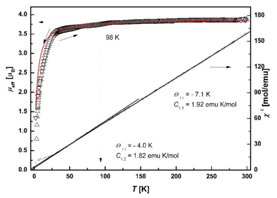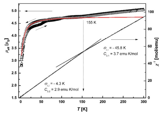where μeff(LS) = 1.73 μB is the theoretical value for LS Fe(III) ions, and μeff(HS) = 5.91 μB − for HS Fe(III) ions (g = 2.0), while x is the fraction of LS species, we estimated the LS and HS fractions, which were approximately 62% and 38%, respectively, at room temperature. The μeff value remains nearly temperature-independent in the range of 110–300 K. Between 110 and 90 K, the μeff value decreases to attain a minimum of 3.74 μB at 90 K (note that under the heating (Δ) regime a two-step increase is observed), corresponding to 66% of LS Fe(III) ions and 34% of HS Fe(III) ions. Thus, the slight increase in this range is most likely due to the occurrence of partial SCO. Upon further cooling, a drastic decrease in μeff(T) is observed at T < 30 K. Such behavior is characteristic of AFM interactions and/or zero-field splitting (ZFS). For clarification, the temperature dependence of the inverse magnetic susceptibility, χ–1(T), was analyzed (Figure 11) under the cooling (∇) regime. It was found that the χ–1(T) data are well described by two Curie–Weiss laws with Weiss constants Θ1.1 = −7.1 K, C1.1 = 1.92 emu K mol–1 (110 < T < 300 K) and Θ1.2 = −4.0 K, C1.2 = 1.82 emu K mol–1 (30 < T < 90 K). Such behavior of χ–1(T) indicates partial SCO with T1/2(1) = 98 K. The negative sign of Θ indicates the presence of AFM interactions between Fe(III) ions. The ZFS has a minor impact on the decrease in μeff(T), since the contribution of the ZFS parameter D to the Weiss constant is small [47].