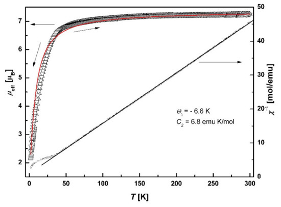 The temperature evolution of the static magnetic susceptibility, χ, in the form of the effective magnetic moment, μeff, for 1, 3, and 2 under heating (Δ) and cooling (∇) regimes are shown in Figure 11, Figure 12 and Figure 13, respectively.