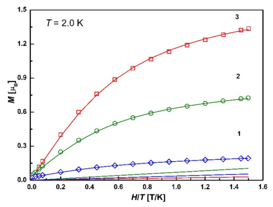 To determine the ground spin state for 1 (◊), 2 (ο), and 3 (?), the field dependences of the magnetization, M(H), were measured at 2.0 K (Figure 14).