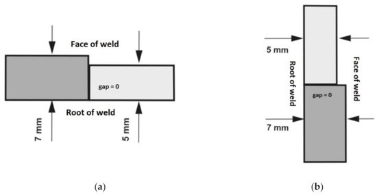 The welding tests were performed in two positions, i.e., in the flat position (PA) (Figure 4a) and in the horizontal position (PC) (Figure 4b). The edges of the plates to be joined were subjected to square butt weld preparation and set up without a gap (b = 0) at the interface.