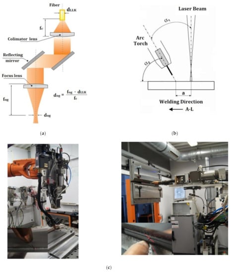 The welding tests were performed in the A–L (arc leading) configuration, i.e., with the arc power source leading the heat source in the process (Figure 5b).