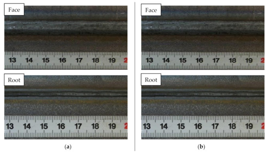 The weld face side and the weld root side of the joints after the hybrid-welding process are presented in Figure 6.