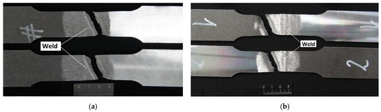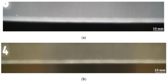 The subsequent stage included the performance of non-destructive radiographic (X-ray) tests aimed to detect (if any) internal welding imperfections. The X-ray tests involved 100% of the joint length. The X-ray photographs of joints no. 1 and 2 are presented in Figure 7. Joint no. 1 and joint no. 2 did not contain any internal welding imperfections.