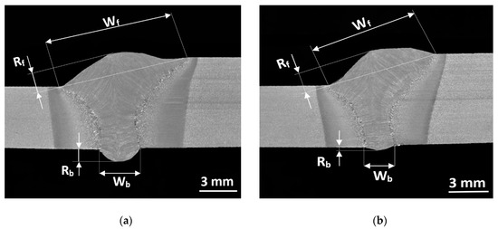 Macrostructure as well as the face and the root of the hybrid-welded joints (having thicknesses of 5 mm and 7 mm): (a) joint no. 1 (PA) and (b) joint no. 2 (PC).