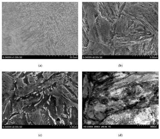 Microstructure of the welded joint made of steel S960QL: (a) fusion line (SEM), (b) HAZ (SEM), (c) weld (SEM), (d) base material—martensite with visible dislocations (STEM), (e) martensite observed in the HAZ (STEM), and (f) laths of martensite in the weld with a visible increase in dislocation density (STEM).