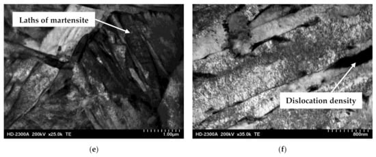 The heat-affected zone (HAZ) contained the coarse-grained martensitic structure (having a thickness of 425 HV10) formed as a result of the welding thermal cycle effect (Figure 9c). In turn, the weld contained the homogenous acicular martensitic structure having a hardness of 350 HV10 (Figure 8d). The above-presented observation results were confirmed by tests performed using a scanning transmission electron microscope (Figure 10a–f).
