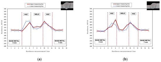 Measurement results and the distribution of hardness in the cross-section of the HLAW joint: (a) joint no. 1 (PA) and (b) joint no. 2 (PC).