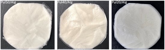 Freeze-drying technique was used to prepare porous matrices. Polymers were added to purified water to obtained separately solutions of pullulan 15% w/w (abcr, Karlsruhe, Germany) and alginate acid sodium salt 4% w/w (Sigma, Steinheim, Germany) respectively. Compounds were homogenized through mechanical stirring (L366, Labinco BV, Breda, The Netherlands) with stirrer speed fixed to avoid air bubbles. Forward, glycerol 95% (Sigma, Steinheim, Germany), methylcellulose (4000 cp, Sigma, Steinheim, Germany), and methylene blue (Alfa Aesar, Kandel, Germany) were added to gain the concentrations in dry mass according to Table 1. Then mixture was aeration and homogenized by mix and whipping at 2340 rpm (Gako e/s, Eprus, Bielsko-Biała, Poland) for 10 min to get a foam, 40.0 g of mixture was transferred to a Petri dish (teflon-coated) and was frozen at −26 °C for 48 h and then freeze-dried at room temperature with ultimate vacuums of 9.0 × 10−2 to 1.3 × 10−1 mBar (Lyovac GT2, Steris, Köln, Germany) for 20 h. Matrices after drying are depicted on Figure 1a,b. were preserved from moisture and light at ambient temperature for another characterization.