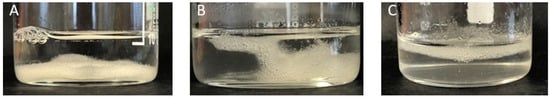 Stages of matrices disintegration (disintegration test of Pul40/Alg formulation in time: (A) matrices after 30 min, (B) matrices after 180 min, (C) matrices after 300 min of the dissolution process (picture taken with Nikon S9300 camera using macro lens).