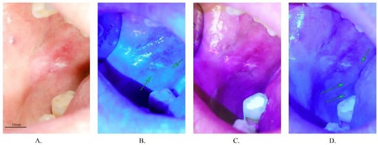 Examples of photographs taken in various wavelengths. (A)—white light—full spectrum, (B)—blue light (450 nm), (C)—violet light (405 nm), (D)—blue and violet light together (405 + 450 nm). Green arrows indicate thin hyperkeratinized areas (brighter sites) which are not able to be seen in the classical white light examination (scale bar 10 mm).