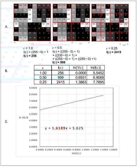 Graphical interpretation of the counting box method of fractal dimension counting. (A)—analysed bitmap, dimension of analysed square size (ε) (B)—Number of squares needed to cover the examined shape in the function of square size (ε). (C)—a straight line drawn through points from table B on the x-y chart in decimal logarithm scale. The slope factor of this straight line is the value fractal dimension counted by the box method [32].