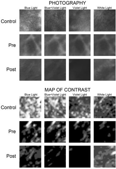 The upper panel consists of photographic images taken intra-orally under blue (450 nm), blue+violet (405 + 460 nm), violet (405 nm), and white light for control mucosa, lichen lesion pre-treatment, and lichen lesion post-treatment. The lower panel shows contrast distribution maps over the surface of the same photographs from the upper panel. White areas indicate areas of locally increased contrast in the image texture. On the contrary, dark areas indicate areas of low contrast (control—healthy mucous, Pre—lesion before treatment, Post—lesion after treatment).