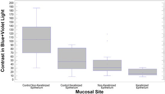 Pathological lesions in keratinized mucosa have significantly worse textural appearance than lesions formed in mucosa covered by non-keratinized epithelium (lower microcontrast value; p < 0.05). This is visible in the blue+violet light.
