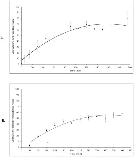 (A)—In vitro cumulative methylene blue release profile of from porous matrix containing 93.5 mg/cm2 methylene blue in dry mass. Results represent mean ± SE, n = 3. (B)—In vitro cumulative triamcinolone acetonide release profile of from porous matrix Pul40/Alg containing 0.05% substance in dry mass. Results represent mean ± SE, n = 3.