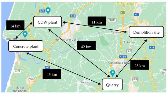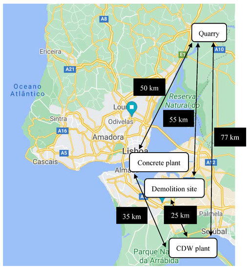- Scenario 2c—CDW is transported from the demolition site to the CDW plant, where the CDW is sorted (therefore, contaminants are minimized), then the CDW is transported to the quarry, where it is crushed, washed, and sieved, and finally RAs are delivered to the ready-mix concrete plant;