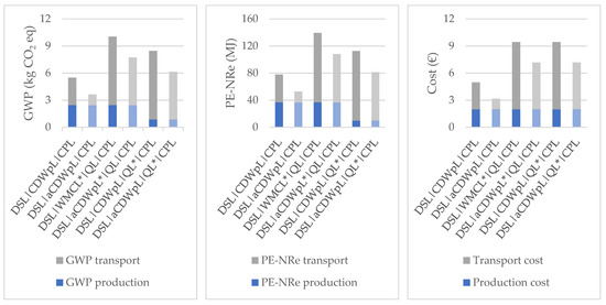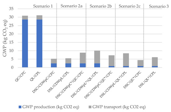 | Scenarios | GWP Production (kg CO2 eq) | GWP Transport (kg CO2 eq) | GWP Total (kg CO2 eq) | |