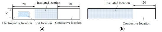 The substrate specification was 60 mm × 10 mm × 3 mm, with a plating area of 20 mm × 10 mm. The non-plated areas of the sample was sealed with insulating material, as shown in Figure 1. The surface of the sample plating area was first ground roughly with corundum grinding wheels of grit size 60# and 80#, and then polished with sponge wheels of grit size 300# and 800#. Eventually, the surface roughness parameter of each sample (Ra = 0.2 μm) was measured using a surface profilometer. The specific process flow is as follows: rough grinding with corundum grinding wheels—fine grinding with sponge wheel—measurement of surface roughness parameter Ra—distilled water rinsing—chemical degreasing—distilled water rinse—electrochemical degreasing—distilled water rinse—nickel plating—distilled water rinse—blow drying, and final testing of plating related parameters.