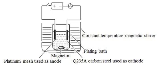 The chemical material used in the electroplating solution was analytically pure and provided by Tianjin Guangfu Fine Chemical Research Institute in Tianjin, China. The composition and content of the plating solution were respectively: (1) NiSO4-6H2O, 240 g/L; (2) NiCl2-6H2O, 20 g/L; (3) H3BO3, 20 g/L. The direct current nickel plating apparatus is shown in Figure 2.