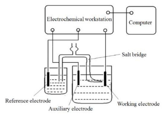 A three-electrode and two-loop system was used to test the redox behavior of nickel ions in the plating solution. A Luggin capillary salt bridge was prepared using agar powder C12H18O9 and potassium nitrate KNO3. A three-electrode system, with Q235A as the working electrode, platinum as the auxiliary electrode, and saturated calomel electrode (SCE) as the reference electrode, was established to test the electrochemical behavior of Ni2+ with an electrochemical workstation CHI660E, Beijing Chinese science days Technology Co., Ltd., Beijing, China and a computer, as shown in Figure 3. On the basis of this test, a reasonable range of temperature and pH of the plating solution for nickel plating was determined.