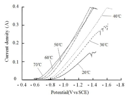 The cathodic polarization curves measured by the constant potential method at different temperatures are shown in Figure 4, starting from the open circuit potential and scanning at 1 mV/s. According to Figure 4, the cathodic polarization in the plating solution basically decreased with increasing temperature, which was consistent with the theoretical analysis. When the voltage was between −0.57 V and −0.7 V, the nickel deposition current was low at different temperatures in the plating solution, and the lower the temperature of the bath, the lower the deposition current. When the voltage was negative up to −0.7 V, the nickel deposition current increased as the bath temperature rose. This is due to the fact that the potential does not reach the potential at which nickel deposition begins under low overpotential conditions, which means that the significant reduction precipitation reaction of nickel has not yet begun. Therefore the current density is relatively low. When the potential shifted negatively and the overpotential reached a certain value, the nickel reduction reaction began and the current rose significantly. Increasing the temperature in the plating solution reduces the viscosity of the solution, which can intensify the thermal movement of the ions in the solution, facilitating the transport of ions to the cathode surface, increasing the rate of mass transfer in the liquid phase, reducing the concentration polarization, and increasing the current at the same overpotential. When the temperature of the plating solution exceeded 50 °C, the cathode current density increased as the temperature of the plating solution increased, which accelerated the deposition of the cathode nickel layer. However, too high a temperature of the plating solution would also accelerate the evaporation of the plating solution. According to the test results, a reasonable bath temperature for nickel plating on mild steel surfaces is between 40 °C and 60 °C.