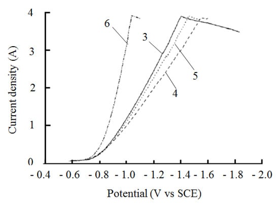 Figure 5 shows the cathodic polarization curves for different plating solution pH values. When the pH in the plating solution increased from 3.0 to 4.0, cathodic polarization was enhanced. When the pH value in the plating solution was 3, the solution became more acidic and a massive reduction of hydrogen inhibited the deposition of nickel ions. Increasing the pH value in the plating solution increased the cathodic overpotential and increased the cathodic current efficiency. By continuing to increase the pH to 6.0, the ions OH− & and Ni2+ in the plating solution generated Ni(OH)2 impurities, which affected the quality of the coating. Based on the analysis above, the pH value of the plating solution was reasonably chosen to be between 3.0 and 5.0.