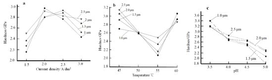 Effect of plating process parameters on the hardness of the layer: (a) Current density; (b) Temperature of the plating solution; (c) pH.