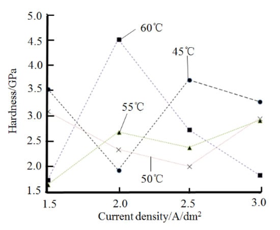 The effects of the plating solution temperature on the microhardness of the plated layer is shown in Figure 6b. According to Figure 6b, when the temperature of the plating solution increases from 45 °C to 60 °C during plating, the hardness of the plated layer shows a pattern that first decreases and then increases. The influence of the bath temperature during plating on the hardness of the coating is mainly related to the cathode overpotential [18]. The hardness of the plating shows a tendency to fall and then rise in relation to the dual effect of the temperature of the plating solution on cathodic polarization during plating. According to the Arrhenius equation, the relationship between the reaction rate constant k and the temperature of the plating solution is as follows: