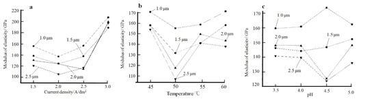Effect of plating parameters on the elastic modulus of the plated layer: (a) current density, (b) temperature of the plating solution, (c) pH.