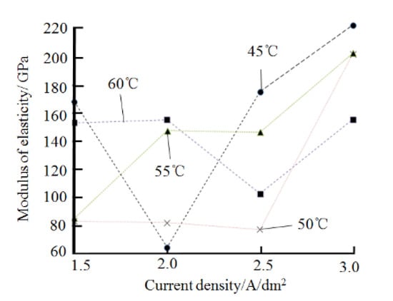 Curves of the relationship between current density, bath temperature, and the elastic modulus of the plated layer.