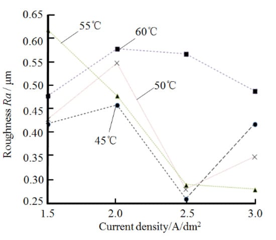 According to the analysis of the experimental results, when the pH value of the plating solution is between 3.5 and 5.0, the change of pH has less effect on the roughness of the surface of the plating layer. Figure 10 shows the relationship between current density, bath temperature, and the surface roughness Ra of the plated layer. According to Figure 10, in order to obtain a smooth surface nickel coating, the preferred plating process parameters are as follows: (1) current density at 2.5 A/dm2, plating solution temperature 45 °C ~55 °C; (2) current density at 3.0 A/dm2, plating solution temperature 50 °C~55 °C.