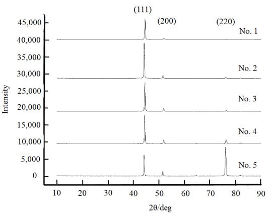 From the samples tested above, five representative specimens are selected for X-ray diffraction testing based on the hardness and elastic modulus of the plating. The effect of the plating process parameters on the selective orientation, residual stress, and grain size of the nickel-plated layers is analyzed. The XRD diffraction pattern of a representative five specimens is shown in Figure 11. According to Figure 11, the diffraction peaks of X-rays appear along the crystal faces (111), (200), and (220) during the testing of five selected representative specimens. From the bottom up, the diffraction peaks on each crystal plane become wider, indicating that the grain size of the coating becomes smaller; from the top downwards, the diffraction peaks on the crystalline plane (200) of the nickel plating gradually increase.