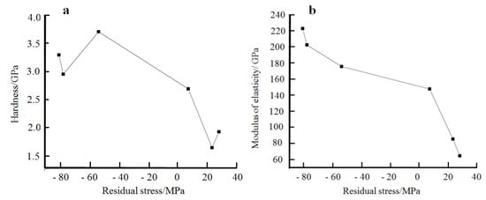 Curve of residual stress in the plating versus hardness and modulus of elasticity. (a) hardness, (b) Modulus of elasticity.