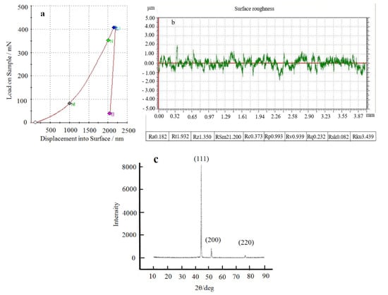 For this study, the nickel plating was prepared using the plating process parameters determined according to orthogonal tests. Figure 13 shows the test results for the preparation of nickel plating with the optimal plating process parameters. In particular, Figure 13a shows the load-displacement curve measured by the Nanoindentation Test System. After analysis and calculation, the microhardness and modulus of elasticity of the nickel plating were obtained at 3.86 GPa and 238 GPa, respectively. The result of the surface roughness parameter Ra for the nickel plating is shown in Figure 13b, at 0.182 μm. Figure 13c shows the X-ray diffraction pattern of the resulting nickel plating, and the display of the nickel plating along the (111) crystalline plane with a selective orientation. The grain size of the nickel coating calculated using Scherrer’s formula is 34.8 nm. High-strength nickel plating on mild steel Q235A surfaces was prepared using the optimal process parameter scheme with good test repeatability.