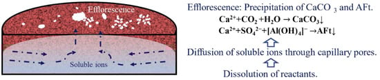 - The efflorescence of ettringite-rich systems results from the ion’s transportation throughout the pores. The capillary absorption results prove that the mineral admixture can optimize the pore structure, and it is directly correlated with efflorescence. By contrast, the capillary absorption of silica fume modified specimen is the lowest, which is totally consistent with the slightest efflorescence.