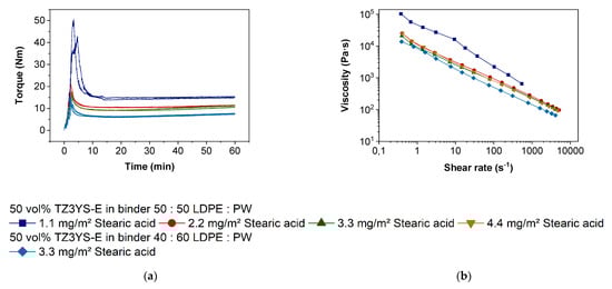 Characterization of the feedstocks flow properties as function of the stearic acid concentration: (a) Time dependent torque evolution during compounding (T = 125 °C); (b) Shear rate dependent melt viscosity (T = 160 °C).