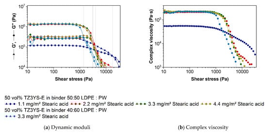 In Figure 3a, the material with 1.1 mg/m2 SA shows decreased dynamic moduli that could be usually observed at low solid contents [34,37,51]. Since the solid content are constant in all materials, the SA is likely responsible for the difference in the rheological behavior. On the one hand, the feedstock with 1.1 mg/m2 uncovered particle surfaces could have a higher friction while flowing than particles with a monomolecular SA layer. On the other hand, there could remain undestroyed agglomerates or bridging flocculation in the feedstock resulting from an incomplete surface coverage due to a lack of SA [37]. In Figure 3b, the complex viscosity of the different materials is depicted. In contrast to the capillary rheometer measurements, the feedstock with only 1.1 mg/m2 SA shows a lower viscosity than the other material, but it must be noticed that the viscosity does not decrease in the same level by leaving the LVE. While being subjugated to high shear stresses, the material with the lowest SA amount reveals higher resistance against the movement equivalent with a higher viscosity. Additionally, the yield point of G′ = G′′ of the feedstock with the lowest amount of SA differs from the other feedstocks with the same binder composition. A significant higher shear stress must be applied to transform this viscoelastic solid to a movable viscoelastic liquid. This is consistent with the observed phenomenon to achieve a small gap prior to the oscillation measurement described earlier.